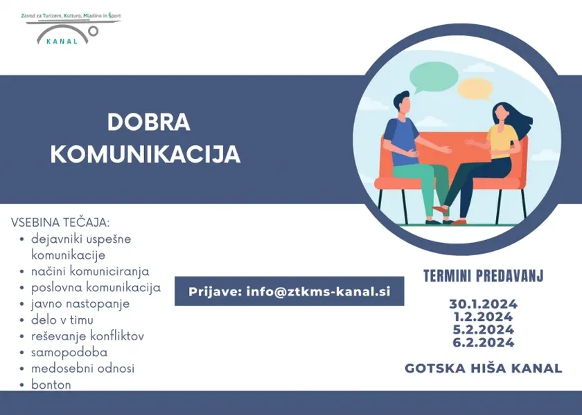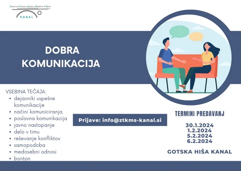 Zavod za turizem, kulturo, mladino in šport Kanal vabi na tečaj "DOBRA KOMUNIKACIJA". Tečaj bo vodila gospa Petra Rutar, NLP trenerka in komunikologinja.